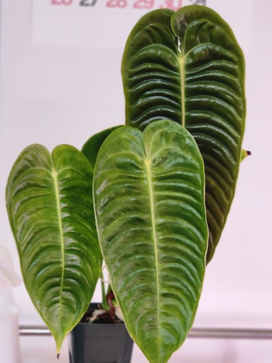 - 안스리움 베이치(Anthurium veitchii): 길고 주름진 잎이 특징이며, 크기가 매우 큼.